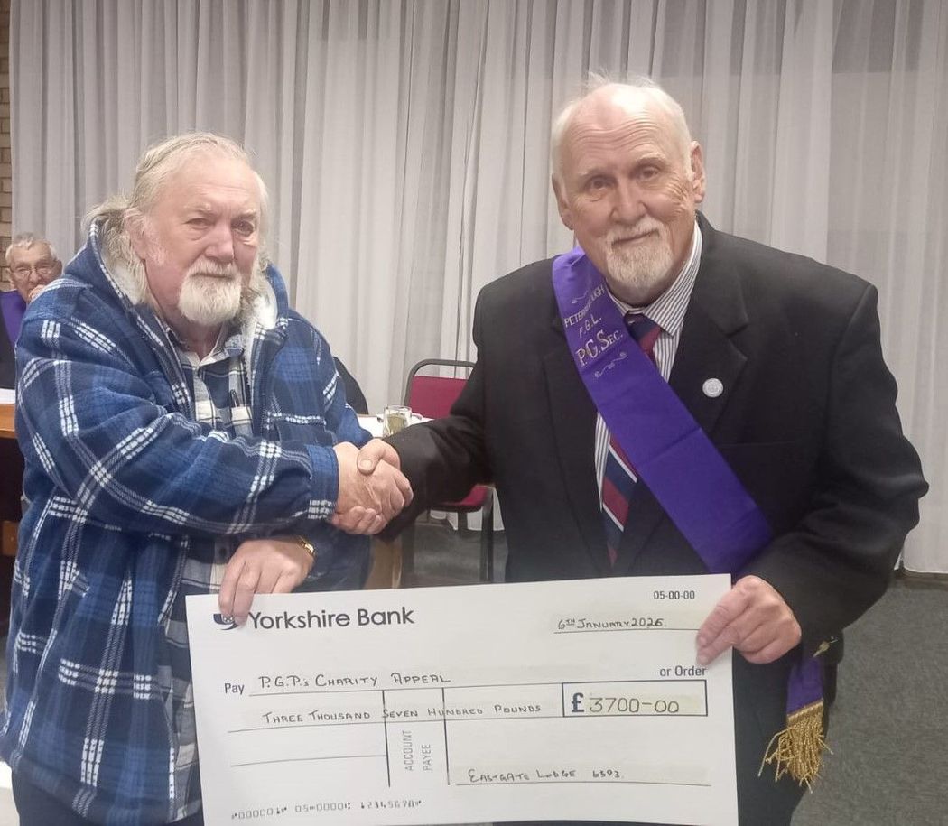 Bro’s of the Eastgate Lodge 6393 chose two charities to support during 2019 and presentations were made to both at our Lodge night on 9th January. No Gain No Pain UK (NGNPUK) and Wood Green the Animals Charity were both presented with £2500.00 on behalf of the Lodge by Bro’s Bill Smith, Pete Pierce & Steve Jones.